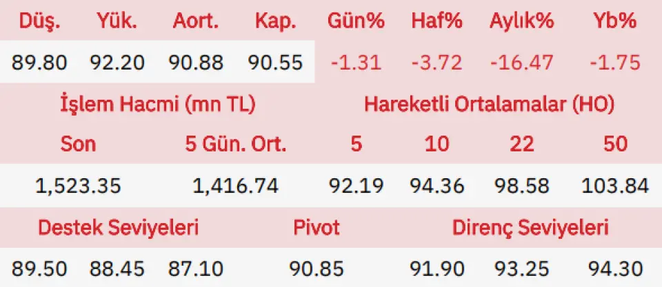 "Seans başlangıcında piyasada önceki gün kapanışından başlayan Ford Otosan hissesi, gün içinde en düşük olarak 89.8 seviyesine gerilerken en yüksek 92.2 değeri gördü ve günü seans açılışına oranla yüzde 1.31 düşüşle, önceki gün kapanış fiyatına göre yüzde 1.31 getiriyle tamamladı.Ford Otosan hissesinde gün içinde olabilecek düşüşlerde ilk destek noktası 89.50 seviyesini onun altında da 88.45 noktasını bekliyoruz, yukarı yönlü hareketlerde de direnç noktaları olarak 91.90 ve 93.25 seviyelerini takip edeceğiz."