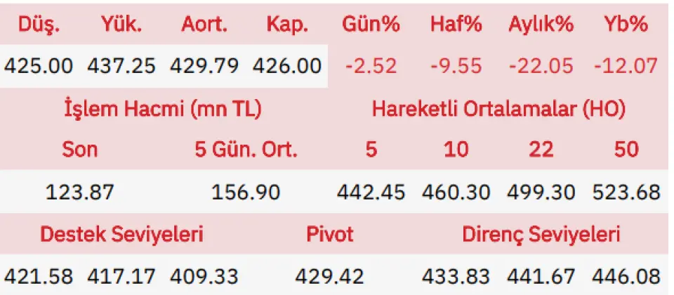 "Güneönceki gün kapanışından başlayan Otokar hissesi, gün içinde en düşük olarak 425 seviyesine gerilerken en yüksek ise 437.25 seviyesini gördü ve günü açılışına göre yüzde 2.52 aşağıda tamamladı.Hissede ilk destek noktası olarak 421.58 seviyesini görüp onun altına düşüş yaşandığında da 417.17 seviyesinde destek noktalarının olacağını bekliyoruz, yukarı yönlü hareketlerde de direnç noktaları olarak 433.83 ve 441.67 seviyeleri takibimizde yer almakta."