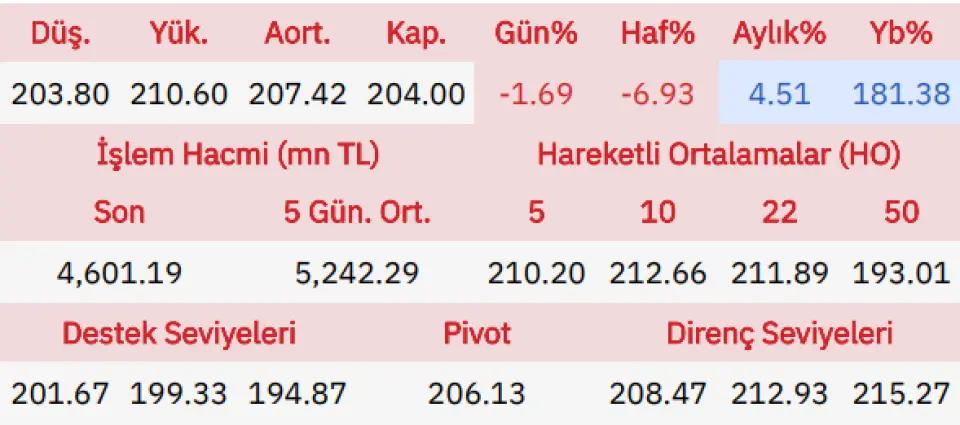 "Güne satışlarla başlayan Aselsan hissesi, gün içinde en düşük olarak 203.8 seviyesine gerilerken en yüksek ise 210.6 seviyesini gördü ve günü açılışına göre yüzde 1.69 aşağıda tamamladı.Hissede ilk destek noktası olarak 201.67 seviyesini görüp onun altına düşüş yaşandığında da 199.33 seviyesinde destek noktalarının olacağını bekliyoruz, yukarı yönlü hareketlerde de direnç noktaları olarak 208.47 ve 212.93 seviyeleri takibimizde yer almakta."