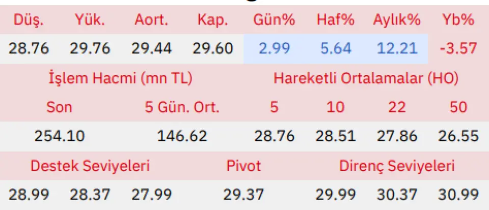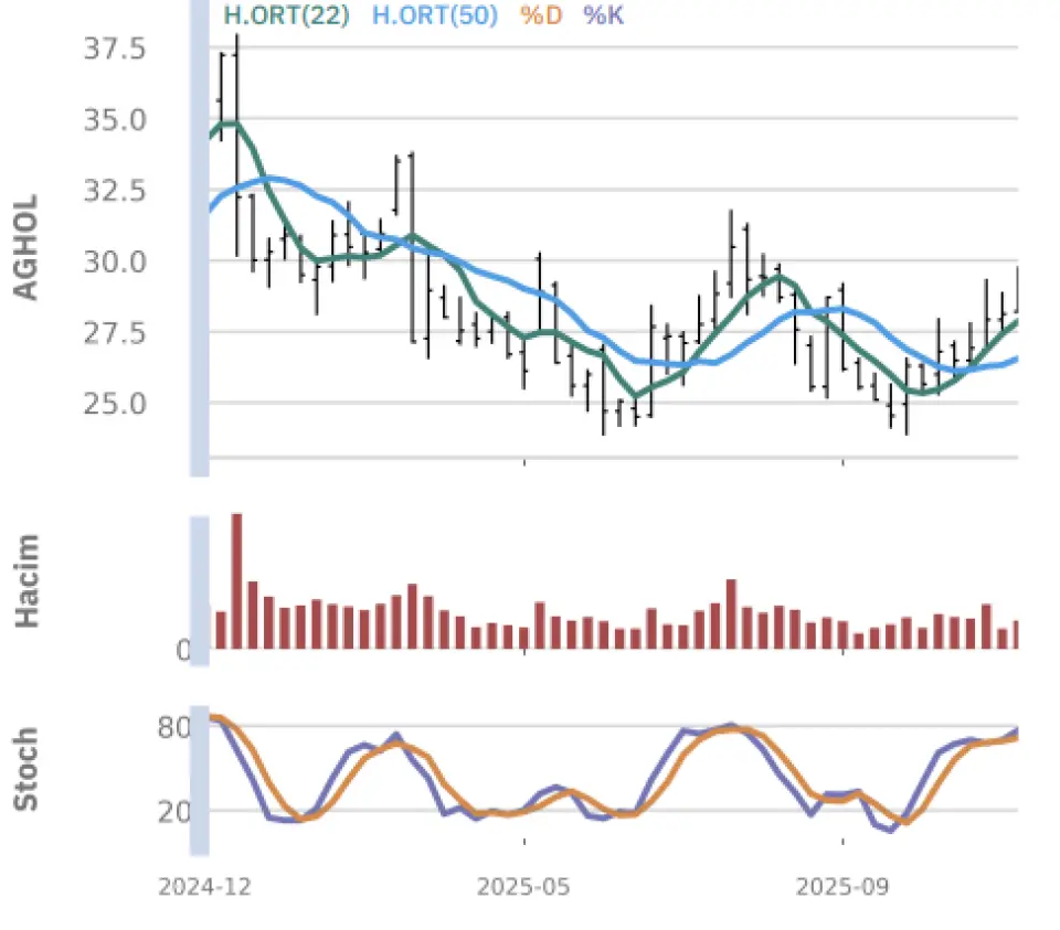 "Gün içinde en düşük 28.76 en yüksek 29.76 seviyesini gören AG Anadolu Grubu Holding hissesinin günü %2.99 kazançla tamamladığı gözlenmektedir. Pivot seviye 29.37 seviyesinden geçmekte olup, aşağı yönlü hareketlerde birinci destek 28.99, ikinci destek ise 28.37 seviyesinden geçmektedir. Dirençler ise sırasıyla 29.99, 30.37 seviyelerinden geçmektedir. Bu aşamada endeksin 5 günlük HO seviyesinin %2.91 üstünde, 22 günlük HO seviyesinin ise %6.23 üstünde hareket ettiği dikkat çekmektedir. Son gün işlem hacmi ise bu aşamada 5 günlük ortalama işlem hacminin % 73.31 üstünde gerçekleşmiştir."