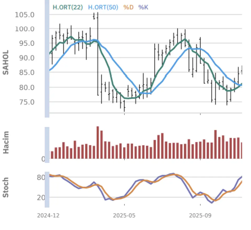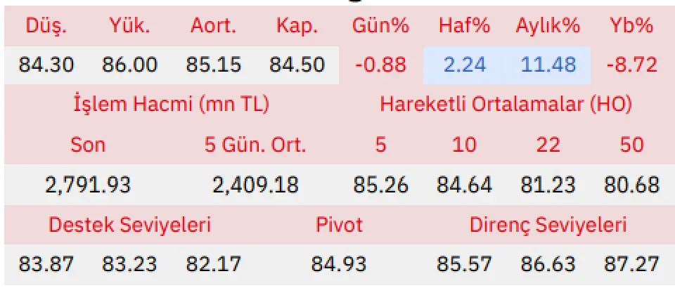 "Gün içinde en düşük 84.30 en yüksek 86.00 seviyesini gören Hacı Ömer Sabancı Holding hissesinin günü %0.88 kayıpla tamamladığı gözlenmektedir. Pivot seviye 84.93 seviyesinden geçmekte olup, aşağı yönlü hareketlerde birinci destek 83.87, ikinci destek ise 83.23 seviyesinden geçmektedir. Dirençler ise sırasıyla 85.57, 86.63 seviyelerinden geçmektedir. Bu aşamada endeksin 5 günlük HO seviyesinin %0.89 altında, 22 günlük HO seviyesinin ise %4.02 üstünde hareket ettiği dikkat çekmektedir. Son gün işlem hacmi ise bu aşamada 5 günlük ortalama işlem hacminin % 15.89 üstünde gerçekleşmiştir."