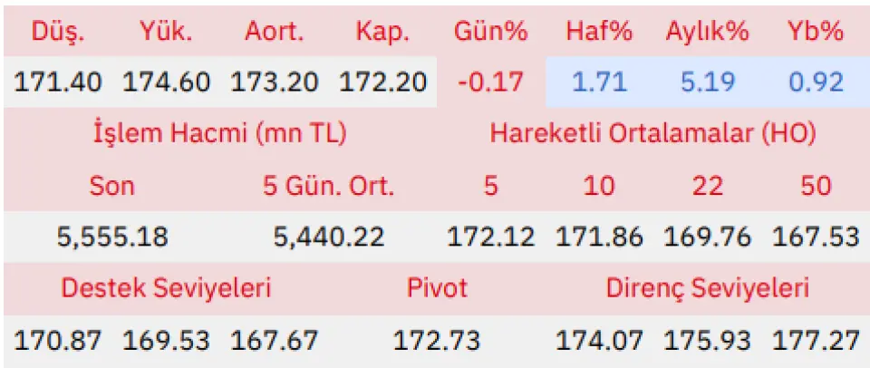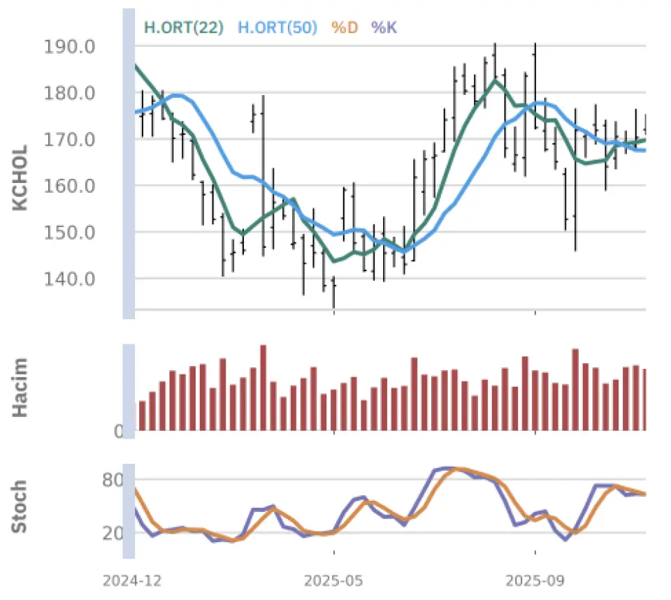 "Gün içinde en düşük 171.40 en yüksek 174.60 seviyesini gören Koç Holding hissesinin günü %0.17 kayıpla tamamladığı gözlenmektedir. Pivot seviye 172.73 seviyesinden geçmekte olup, aşağı yönlü hareketlerde birinci destek 170.87, ikinci destek ise 169.53 seviyesinden geçmektedir. Dirençler ise sırasıyla 174.07, 175.93 seviyelerinden geçmektedir. Bu aşamada endeksin 5 günlük HO seviyesinin %0.05 üstünde, 22 günlük HO seviyesinin ise %1.44 üstünde hareket ettiği dikkat çekmektedir. Son gün işlem hacmi ise bu aşamada 5 günlük ortalama işlem hacminin % 2.11 üstünde gerçekleşmiştir."