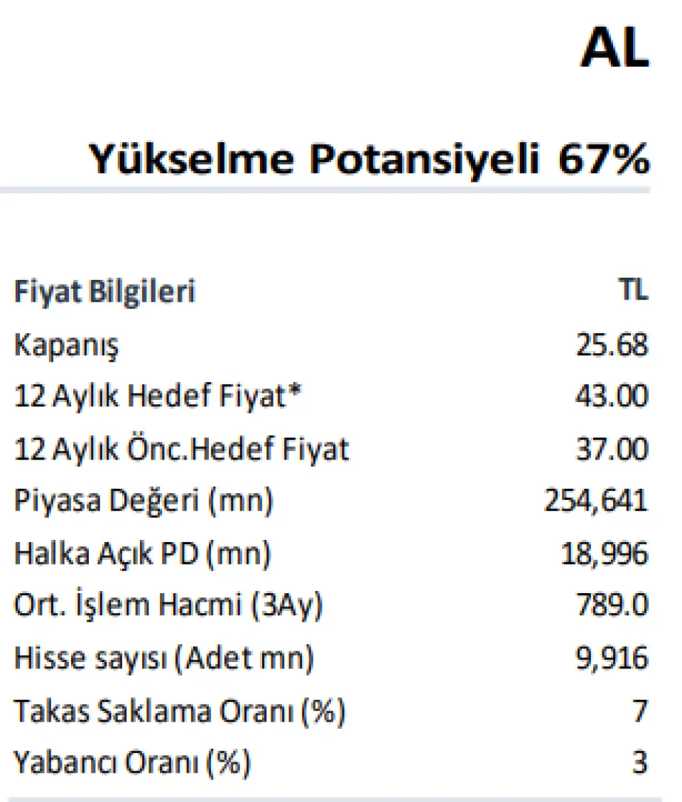 Vakıfbank görünümüne ilişkin pozitif görüşümüzü koruyoruz. Dayanıklı varlık kalitesi ve güçlü ücret-komisyon geliri trendi, yıl sonuna kadar kârlılık görünümünü desteklemeye devam edecek. Hisse başına 43 TL hedef fiyatımız, %67 yükseliş potansiyeline işaret etmektedir.