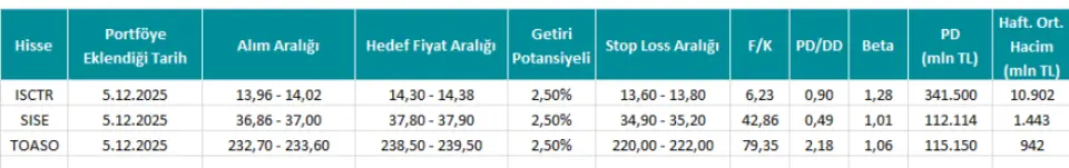 Hisselerin portföyle eklendiği tarih 05.12.2025 olarak kaydedildi. ISCTR hissesi için hedef fiyat aralığı 14,30 - 14,38 olarak açıklandı. SISE hissesine açıklanan hedef fiyat aralığı ise 37,80 - 37,90 olarak listeye yansıdı. Son olarak TOASO hissesi için açıklanan hedef fiyat aralığı 238,50 - 239,50 olarak yatırımcılar ile paylaşıldı.