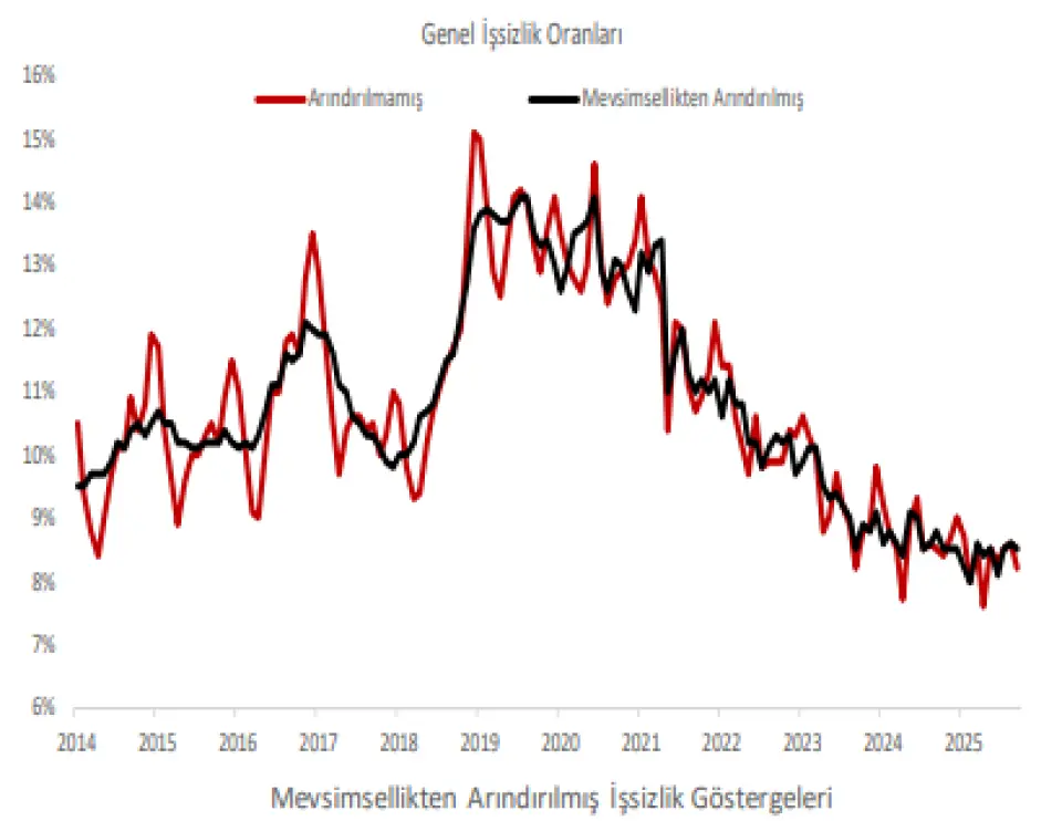 Mevsimsellikten arındırılmış verilere göre işsizlik oranı Ekim ayında %8,6’dan %8,5’e indi. İstihdam aylık bazda 185 bin kişi artarak 32 milyon 772 bine, iş gücüne katılım da 157 bin yükselişle 35 milyon 804 bin kişiye çıktı. İşsiz sayısı aylık bazda 27 bin kişilik azalışla 3 milyon 33 bin kişi oldu. Arındırılmamış verilere göre işsizlik oranı %8,2 seviyesinde gerçekleşti.