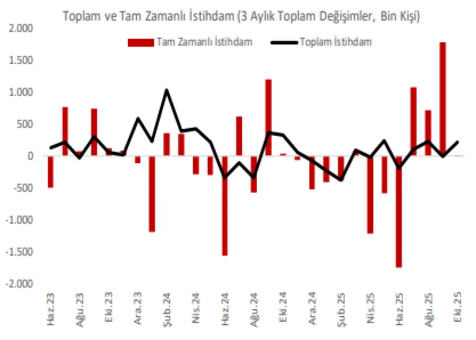 Üç aylık ortalamalara bakıldığında Ekim ayı itibarıyla toplam istihdamdaki yükselişin tam zamanlı istihdamın üzerinde olduğu görülüyor.