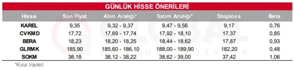 Global Menkul Değerler’in günlük bülteninde yayımlanan teknik analiz bazlı değerlendirmelere göre, bugün Borsa İstanbul’da hareketli bir seyir izlenmesi beklenen hisseler arasında KAREL, CVKMD, BERA, GLRMK ve SOKM öne çıktı. Kurum analistleri, endeksin 10.700 puan desteği üzerinde kalıcılık sağlaması halinde kısa vadeli tepki potansiyelinin artabileceğine dikkat çekiyor. İşlem hacmindeki toparlanmanın da hisse bazlı hareketliliği destekleyebileceği belirtildi.