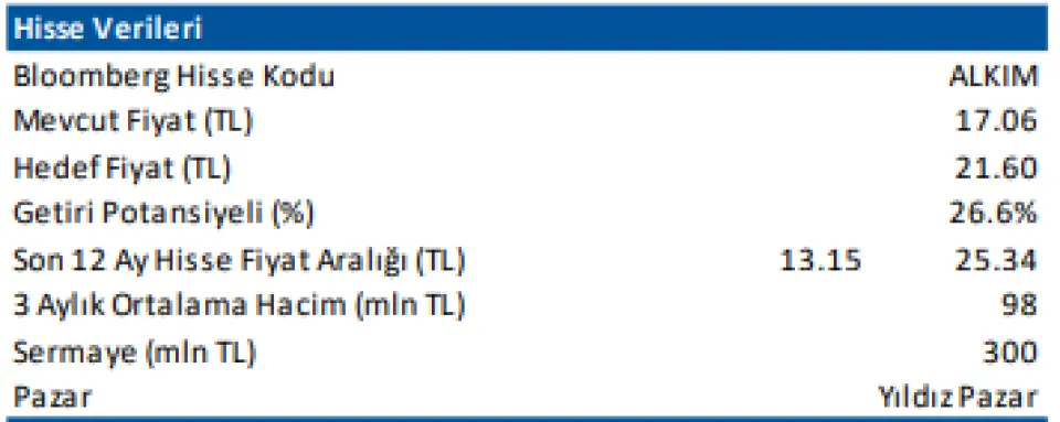 Deniz yatırım Alkim Kimya (ALKIM TI) Toplantı Notu TUT – Hedef Fiyat: 21,60 TL (12-ay)