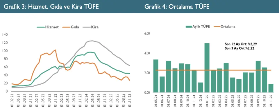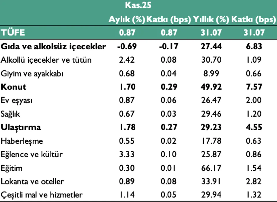 TÜİK verilerine göre Kasım 2025’te tüketici fiyat endeksi (TÜFE) aylık %0,87 artarken yıllık enflasyon %31,07 seviyesine geriledi. Kuveyt Türk Yatırım Araştırma ve piyasa konsensüs beklentileri aylık artışın %1,30 olacağı yönündeydi.