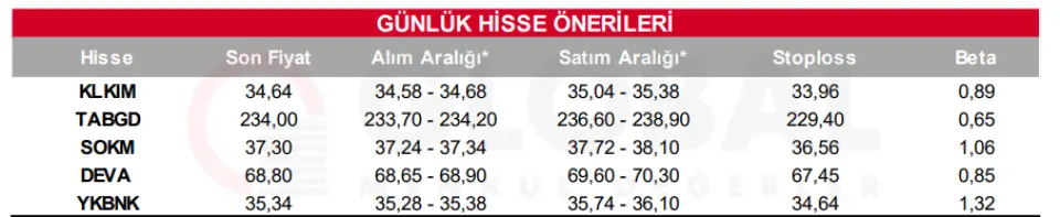 2 Ekim 2025 tarihinde Global Menkul Değerler tarafından paylaşılan günlük bültende, KLKIM, TABGD, SOKM, DEVA ve YKBNK olmak üzere toplam 5 hisse, günlük hisse önerileri listesinde yer almış oldu.