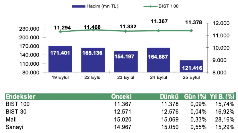Güne yükselişle başlayan BIST 100 Endeksi, seans içerisinde dalgalı bir seyir izlerken günü %0,09 yükselişle 11.377,55 puandan kapattı.