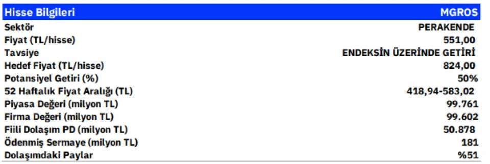 Gedik Yatırım MGROS için 824 TL hedef fiyat tespit etti ve endeks üzeri kazanç potansiyeli gördüğünü açıkladı. MGROS borsada son günlerde 523 TL fiyattan işlem görüyor. Bu hedef fiyatla hissede beklenen kazanç %50 oranında.