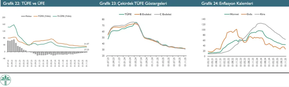 - "TÜİK verilerine göre Kasım 2025’te tüketici fiyat endeksi (TÜFE) aylık %0,87 artarken yıllık enflasyon %31,07 seviyesine geriledi. Kuveyt Türk Yatırım Araştırma ve piyasa konsensüs beklentileri aylık artışın %1,30 olacağı yönündeydi. Çekirdek enflasyonda da benzer bir iyileşme dikkat çekti. TÜFE (B) endeksi aylık %1,27 artışla yıllık %32,17’ye, TÜFE (C) endeksi ise aylık %1,22 artışla yıllık %31,65’e geriledi. Hizmet enflasyonu ise aylık %1,46 ile Ocak 2025’ten bu yana en zayıf artışı kaydetti. Böylece hizmet grubunun üç aylık ortalama artışı %2,85’ten %2,45’e düştü."