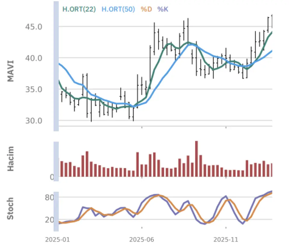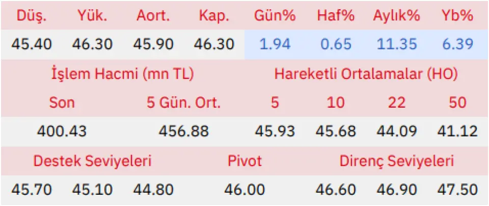 "Gün içinde en düşük 45.40 en yüksek 46.30 seviyesini gören Mavi Giyim hissesinin günü %1.94 kazançla tamamladığı gözlenmektedir. Pivot seviye 46.00 seviyesinden geçmekte olup, aşağı yönlü hareketlerde birinci destek 45.70, ikinci destek ise 45.10 seviyesinden geçmektedir. Dirençler ise sırasıyla 46.60, 46.90 seviyelerinden geçmektedir. Bu aşamada endeksin 5 günlük HO seviyesinin %0.80 üstünde, 22 günlük HO seviyesinin ise %5.01 üstünde hareket ettiği dikkat çekmektedir. Son gün işlem hacmi ise bu aşamada 5 günlük ortalama işlem hacminin % 12.35 altında gerçekleşmiştir."