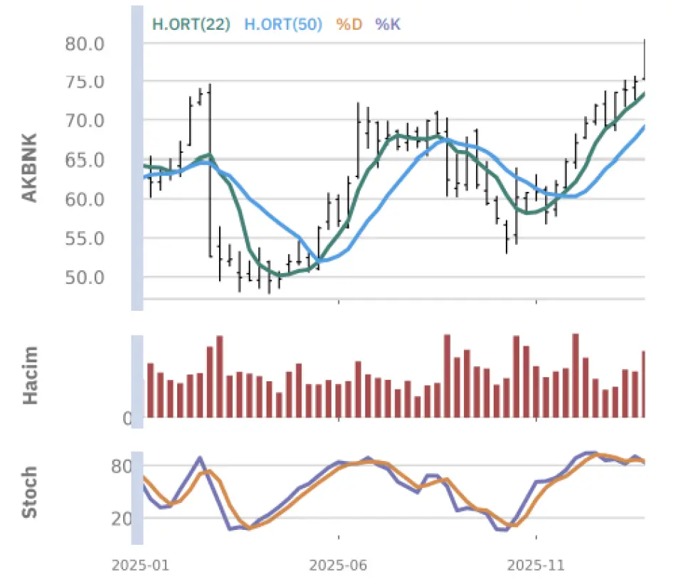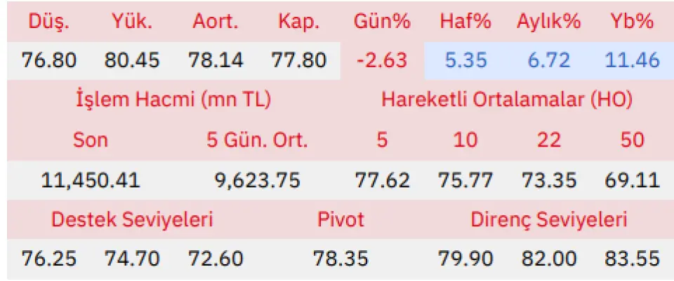 "Gün içinde en düşük 76.80 en yüksek 80.45 seviyesini gören Akbank hissesinin günü %2.63 kayıpla tamamladığı gözlenmektedir. Pivot seviye 78.35 seviyesinden geçmekte olup, aşağı yönlü hareketlerde birinci destek 76.25, ikinci destek ise 74.70 seviyesinden geçmektedir. Dirençler ise sırasıyla 79.90, 82.00 seviyelerinden geçmektedir. Bu aşamada endeksin 5 günlük HO seviyesinin %0.23 üstünde, 22 günlük HO seviyesinin ise %6.06 üstünde hareket ettiği dikkat çekmektedir. Son gün işlem hacmi ise bu aşamada 5 günlük ortalama işlem hacminin % 18.98 üstünde gerçekleşmiştir."