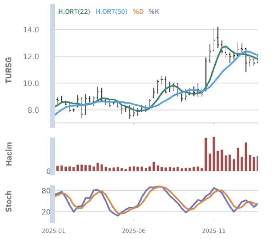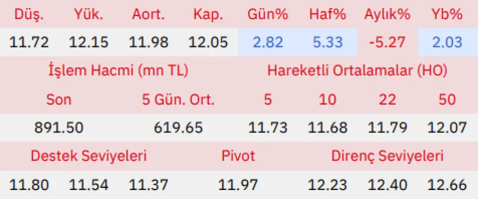 "Gün içinde en düşük 11.72 en yüksek 12.15 seviyesini gören Türkiye Sigorta hissesinin günü %2.82 kazançla tamamladığı gözlenmektedir. Pivot seviye 11.97 seviyesinden geçmekte olup, aşağı yönlü hareketlerde birinci destek 11.80, ikinci destek ise 11.54 seviyesinden geçmektedir. Dirençler ise sırasıyla 12.23, 12.40 seviyelerinden geçmektedir. Bu aşamada endeksin 5 günlük HO seviyesinin %2.75 üstünde, 22 günlük HO seviyesinin ise %2.17 üstünde hareket ettiği dikkat çekmektedir. Son gün işlem hacmi ise bu aşamada 5 günlük ortalama işlem hacminin % 43.87 üstünde gerçekleşmiştir."