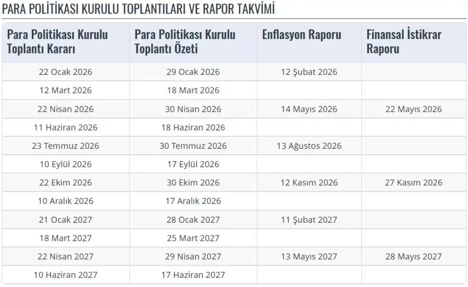 Türkiye Cumhuriyeti Merkez Bankası (TCMB) 2026 yılı ve 2027 yılının başı için takvimini yayımladı. Merkez Bankası'nın bu seneki Para Politikası Kurulu toplantılarının ilki 22 Ocak'ta yapılacak ve sonuncusu da 10 Aralık'ta düzenlenecek. Banka yine 8 toplantı gerçekleştirecek.