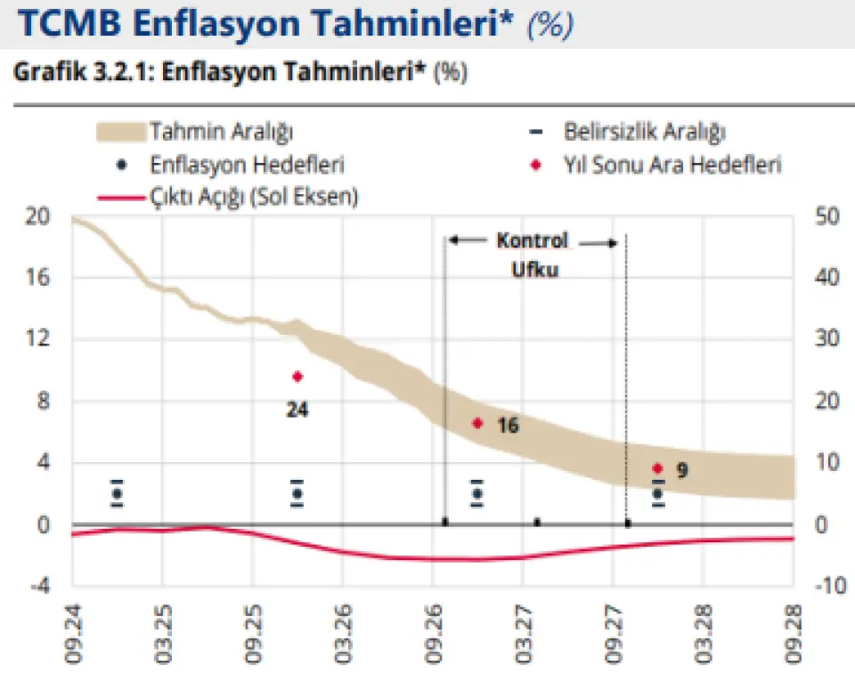 Çeyrek Enflasyon Raporu sunumunda, 2025 yılına ilişkin tahmin aralığı %25 - %29 bandından %31 - %33 bandına revize edildi.