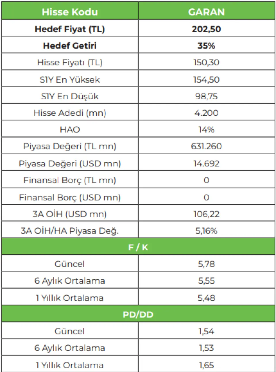 İnfo Yatırım GARAN hissesine 202,50 TL hedef fiyat açıkladı. Bu hedef hissede %35 kazanç potansiyeli anlamına geliyor.
