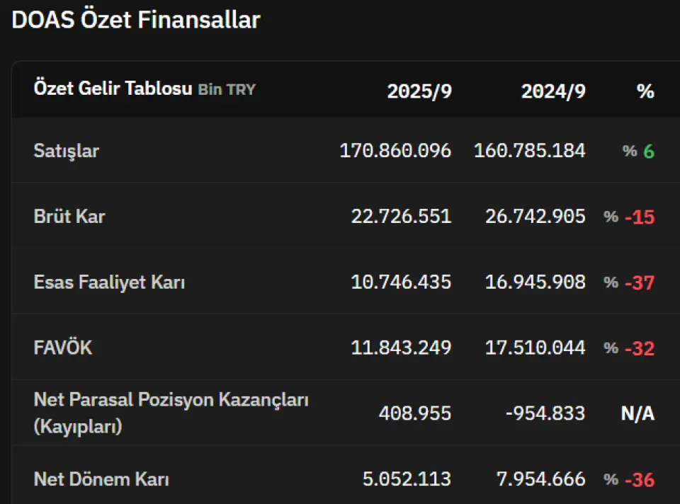 Doğuş Otomotiv (DOAS) 2025 yılı 3.çeyrek döneminde 2.12 milyar TL net kar açıkladı. 3Ç25 döneminde bir önceki yılın aynı çeyreğine göre hasılat %15 oranında artarak 58.2 milyar TL seviyesinde gerçekleşti. Satışlardaki yükseliş nedeniyle satışların maliyeti artsada 3Ç25 döneminde hasılat/satışların maliyeti rasyosu %86,54 olarak gerçekleşerek yaklaşık %1 oranında iyileşti (3Ç24: %87,52) . Hasılatta yaşanan artışa bağlı olarak 3Ç25’te brüt kar marjı %24 oranında iyileşerek 7.8 milyar TL oldu. Genel yönetim ve pazarlama giderlerinde sınırlı artış yaşanırken diğer faaliyet gelirlerinde yaşanan %46 oranındaki gerileme esas faaliyet karını baskıladı. Şirketin özkaynek yöntemiyle değerlenen yatırımlarında VDF servisten kaynaklanan değerleme farkı ile birlikte FVÖK %101 oranında artarak 4.357 milyon TL olarak gerçekleşti. Finansman giderleri %42 oranında artarak karlılığı baskılayan önemli bir unsur olsa da VÖK %95 oranında artış göstererek 2.962 milyon TL olarak gerçekleşti.