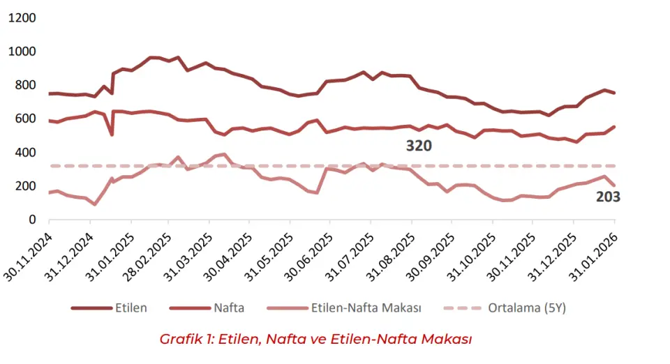 30 Ocak itibarıyla ortalama Etilen-Nafta makasının geçtiğimiz haftaya göre %21,2 azalışgöstererek 203 $ bandına yükseldiğini görüyoruz. Sektör özelinde belirleyici olan majör haber