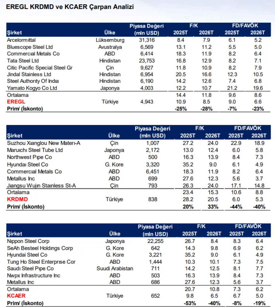 • EREGL 2026 yılı tahmini F/K çarpanına göre uluslararası benzerlerine kıyasla %28 iskontolu işlem görmekte, FD/FAVÖK çarpanı bazında ise %23 iskontoludur.