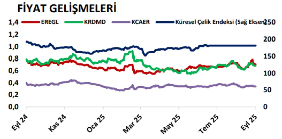 • Son bir haftada EREGL %0,9, KRDMD %3,7 ve KCAER %2,5 oranında değer kaybetti. Çin limanlarındaki stok yoğunluğu ve önümüzdeki dönemde güçlü arzın daha da artacağına dair endişeler ile birlikte AB’nin Çin çeliğine yönelik olası tarife planları (%25-%50 arası) sektörde kısa vadeli dalgalanmayı artırırken, nihai ürün fiyatlarının yukarı yönlü hareketini de sınırlamakta. Diğer yandan devam eden zayıf iç talep ve çelik marjlarının yeniden zayıflamaya başlaması, ürün fiyatları üzerinde aşağı yönlü risk endişelerini de artırmakta. Her ne kadar bu yıl için nihai ürün fiyatlarında belirgin bir değişim beklemiyor olsak da orta-uzun vadede çelik fiyatlarında ılımlı toparlanma öngörüyor ve üreticilerin maliyet ve kapasite yönetimi ile küresel ticaret politikalarındaki gelişmelerin fiyatlar üzerinde belirleyici rol oynamaya devam edeceğini düşünüyoruz.