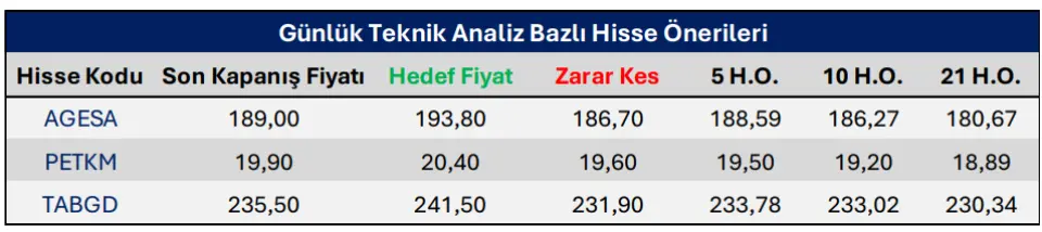 PhillipCapital, 15 Ekim 2025 tarihine ait günlük bültenini yayınladı. Yayınlanan bültende 3 farklı hisse için teknik analiz hisse önerileri paylaşıldı. PhillipCapital tarafından paylaşılan teknik analiz hisse önerileri, AGESA, PETKM ve TABGD hisseleri için yapıldı. Paylaşılan önerilerin detaylarına bakacak olursak;