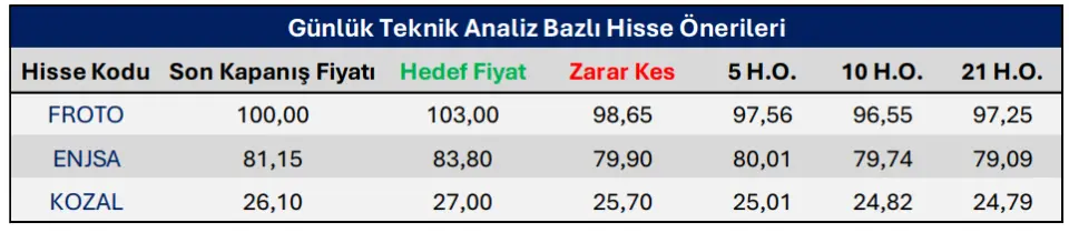 PhillipCapital, 27 Ekim 2025 tarihine ait günlük bültenini yayınladı. Yayınlanan bültende 3 farklı hisse için teknik analiz hisse önerileri paylaşıldı. PhillipCapital tarafından paylaşılan teknik analiz hisse önerileri, ENJSA, FROTO ve KOZAL hisseleri için yapıldı. Paylaşılan önerilerin detaylarına bakacak olursak;