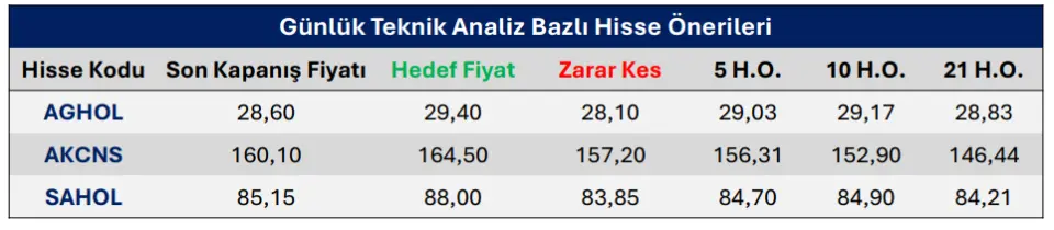 PhillipCapital, 25 Aralık 2025 tarihine ait günlük bültenini yayınladı. Yayınlanan bültende 3 farklı hisse için teknik analiz hisse önerileri paylaşıldı. PhillipCapital tarafından paylaşılan teknik analiz hisse önerileri, AGHOL, AKCNS ve SAHOL hisseleri için yapıldı. Paylaşılan önerilerin detaylarına bakacak olursak;