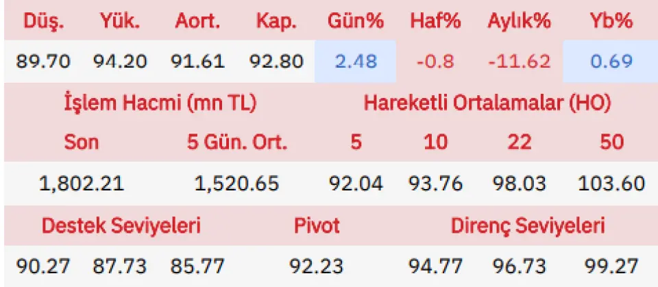 "Ford Otosan güne alımlarla başlarken gün içinde en düşük 89.70 seviyesini gördü (kapanışa göre 0.85 TL) ve en yüksek olarak 94.20 değerine gelip (kapanışa göre -3.65 TL) ve günü başlangıcına oranla %2.94 pozitif önceki kapanışına göre %2.48 pozitif tamamladı.Hissenin ilk destek noktası 90.27 onun altında da 87.73 noktası olacaktır, yükselişlerde de direnç noktaları olarak 94.77 ve 96.73 seviyeleri takip edeceğiz."