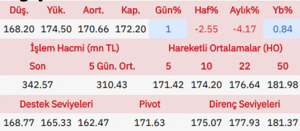 "Doğuş Otomotiv güne alımlarla başlarken gün içinde en düşük 168.20 seviyesini gördü (kapanışa göre 2.30 TL) ve en yüksek olarak 174.50 değerine gelip (kapanışa göre -4.00 TL) ve günü başlangıcına oranla %1.06 pozitif önceki kapanışına göre %1 pozitif tamamladı.Doğuş Otomotiv hissesinde gün içinde olabilecek düşüşlerde ilk destek noktası 168.77 seviyesini onun altında da 165.33 noktasını bekliyoruz, yukarı yönlü hareketlerde de direnç noktaları olarak 175.07 ve 177.93 seviyelerini takip edeceğiz."