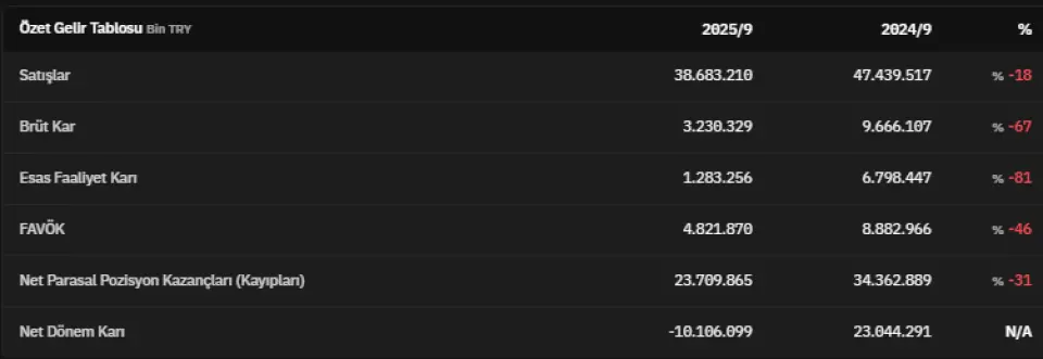 Satışlar 2025 yılının 3. çeyreğinde 38.683.210.000 TL olarak açıklandı. 2025 yılının üçüncü çeyreğinde brüt kar 3.230.329.000 TL olarak açıklandı. 2024 yılının üçüncü çeyreğinde ise bu veri 9.666.107.000 TL olarak açıklanmıştı. Esas faaliyet karını 1.283.256.000 TL olarak açıklayan SASA, 2024 yılının üçüncü çeyreğinde esas faaliyet karını 6.798.447.000 TL olarak açıklamıştı.FAVÖK 2025 yılının üçüncü çeyreğinde 4.821.870.000 TL olarak açıklandı. Net parasal pozisyon kazançları 2025 yılının üçüncü çeyreğinde 23.709.865.000 TL olarak açıklandı. Net dönem kârı ise -10.106.099.000 TL olarak kaydedildi. İlgili veri 2024 yılının üçüncü çeyreğinde 23.044.291.000 TL olarak açıklanmıştı.