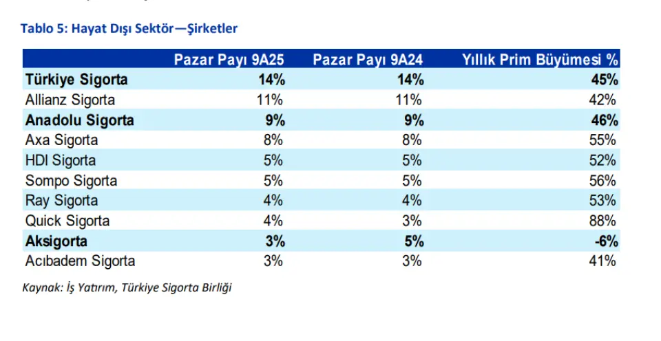 2025'in ilk dokuz ayında en yüksek prim üretimine sahip şirket %14 pazar payı ile Türkiye Sigorta olurken, onu %11 pazar payı ile Allianz Sigorta ve %9 payla Anadolu Sigorta takip etmektedir. Aksigorta, geçen yılın aynı döneminde sahip olduğu %5 pazar payını bu yıl bir miktar kaybederek %3'e gerilemiş ve 9. sırada yer almıştır.