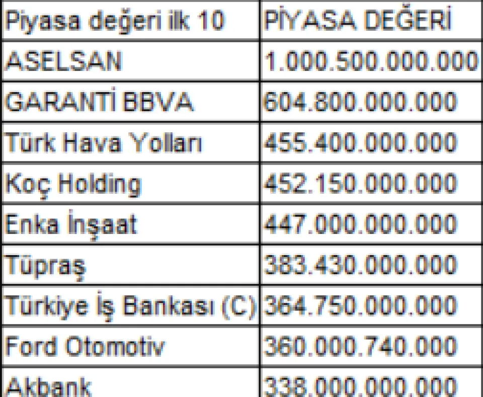 BIST 100 endeksine dahil ve piyasa değeri açısından en büyük 10 şirketin piyasa değeri şöyle: