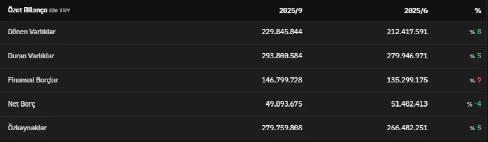 2025 yılının üçüncü çeyreğinde net borç 49.093.675.000 TL olarak açıklandı. Özkaynaklar 2025 yılının üçüncü çeyreğinde 279.759.808.000 TL olarak açıklandı. İlgili veri 2025 yılının ikinci çeyreğinde 266.482.251.000 TL olarak açıklanmıştı.