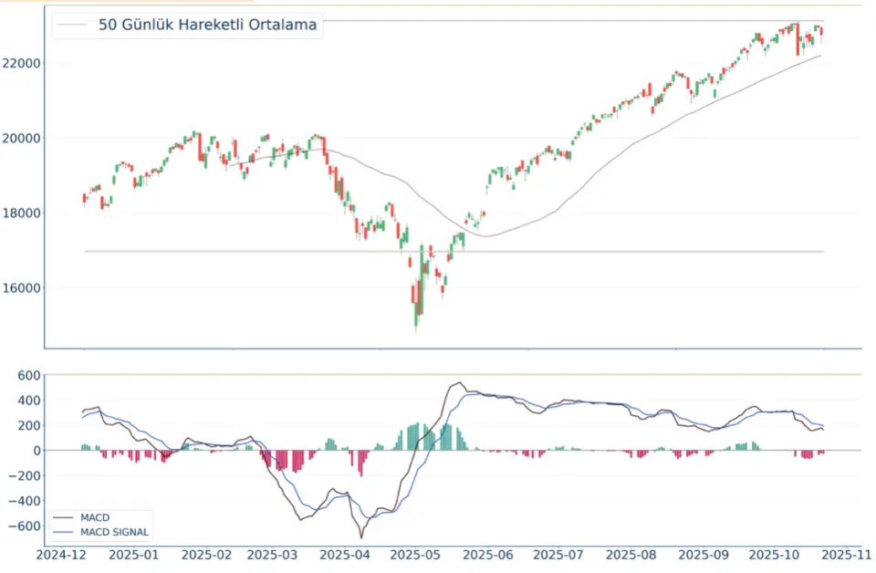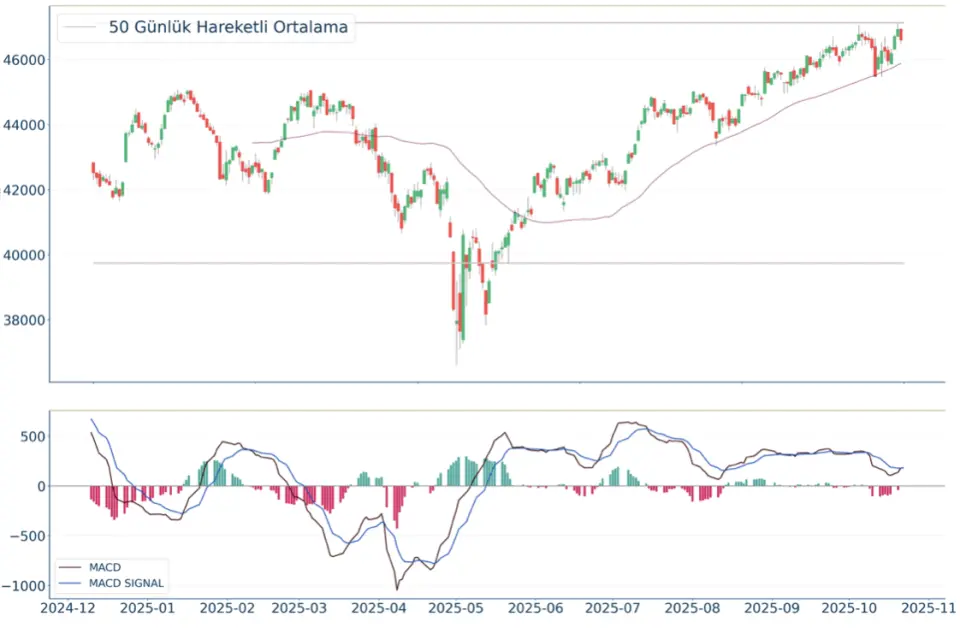 Dow Jones Endeksi geçtiğimiz gün %0.71 azalarak 46.590 seviyelerinden işlem görüyorken 50 günlük hareketli ortalaması olan 45.877 seviyesinin de %2 üzerinde seyrediyor. Bu seviyeye göre Dow Jones Endeksi için orta vadeli negatif görünüm hakimdir. Destek ve direnç seviyeleri; Yükseliş halinde ilk direnç olarak 47.685 seviyesi takip edilirken bu direncin de geçilmesi halinde 47.987 takip edilebilir. Negatif hareketlerde ise destekler 46.263 ve 45.454 olarak izlenebilir.