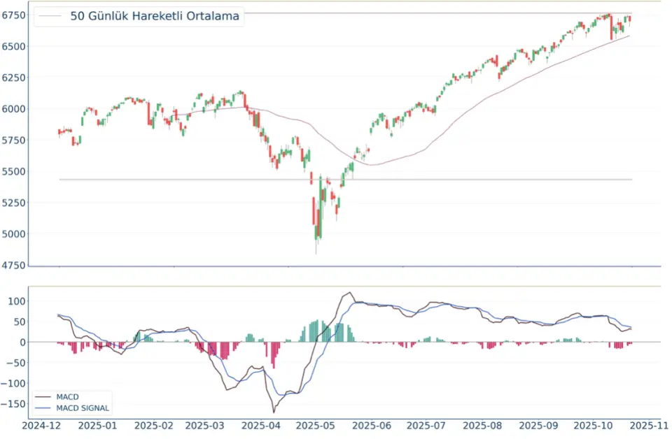 S&P 500 Endeksi, geçtiğimiz günü %0.53 düşüş ile kapattıktan sonra, 20 günlük hareketli ortalaması olan 6.683 seviyesinin üzerinde fiyatlanıyor. Bu durum S&P 500 Endeksi için aylık periyotta pozitif bir görüntü çiziyor. Son günde yapılan işlemlerde ise en yüksek 6.741 seviyesinde işlem gördükten sonra günü 6.699 seviyesinde tamamladı. Öte yandan, trend göstergelerinden biri olan MACD çizgisi sinyal çizgisinin altında, pozitif bölgede yer alıyor. 6.850-6.902 dirençler, 6.640-6.522 destekler olarak değerlendirilebilir.