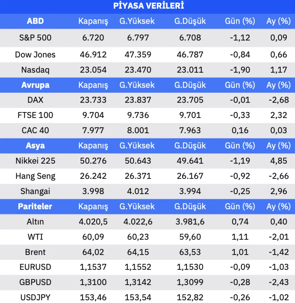 Hükümetin kapanmasının 38. güne girmesi veri akışını sınırlarken, yatırımcılar Fed yetkililerinden gelecek yeni açıklamaları bekliyor. Çarşamba günü güçlü ADP ve ISM verileriyle yükselen tahvil faizleri, perşembe günü zayıf istihdam verisiyle hızla geri çekildi; 10 yıllık tahvil faizi 7,6 baz puan düşerek ekim ayından bu yana en sert gerilemeyi kaydetti.