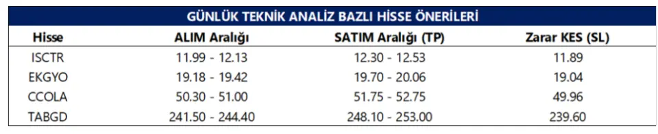 Böylece Tacirler Yatırım tarafından 22 Ekim 2025 tarihinde paylaşılan günlük teknik analiz bazlı hisse önerileri listesinde, ISCTR, EKGYO, CCOLA ve TABGD hisseleri olmak üzere toplam 4 hisse yer almış oldu.