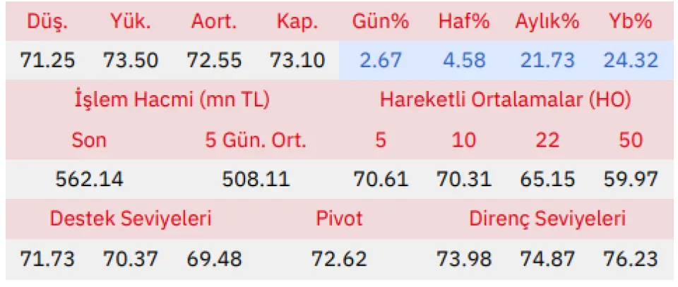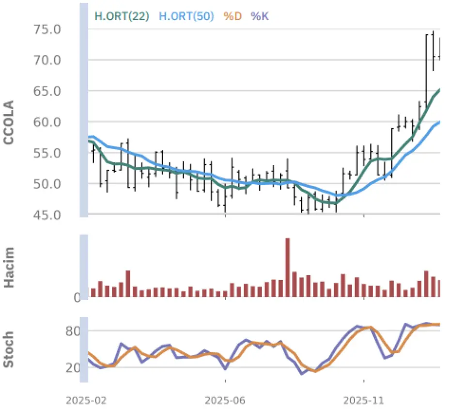 "Gün içinde en düşük 71.25 en yüksek 73.50 seviyesini gören Coca-Cola İçecek hissesinin günü %2.67 kazançla tamamladığı gözlenmektedir. Pivot seviye 72.62 seviyesinden geçmekte olup, aşağı yönlü hareketlerde birinci destek 71.73, ikinci destek ise 70.37 seviyesinden geçmektedir. Dirençler ise sırasıyla 73.98, 74.87 seviyelerinden geçmektedir. Bu aşamada endeksin 5 günlük HO seviyesinin %3.53 üstünde, 22 günlük HO seviyesinin ise %12.20 üstünde hareket ettiği dikkat çekmektedir. Son gün işlem hacmi ise bu aşamada 5 günlük ortalama işlem hacminin % 10.63 üstünde gerçekleşmiştir."