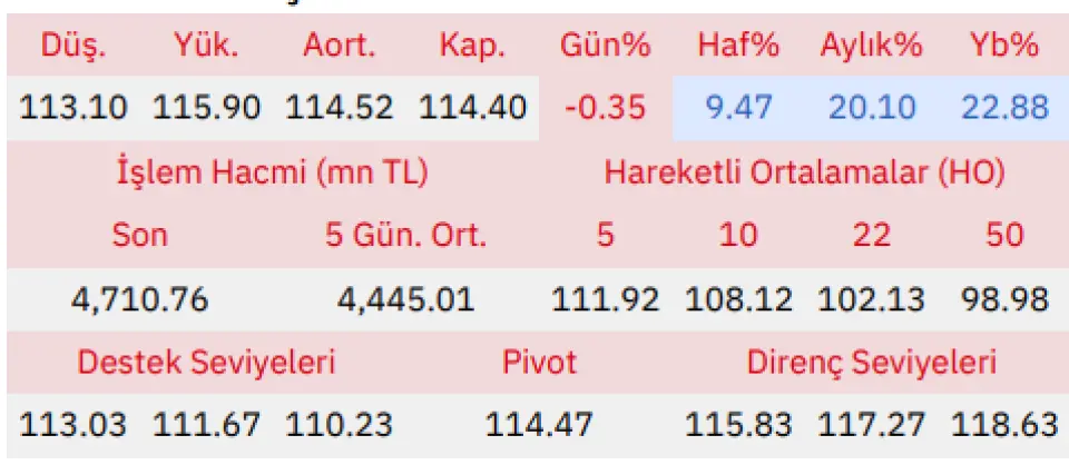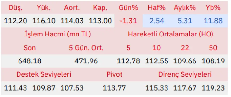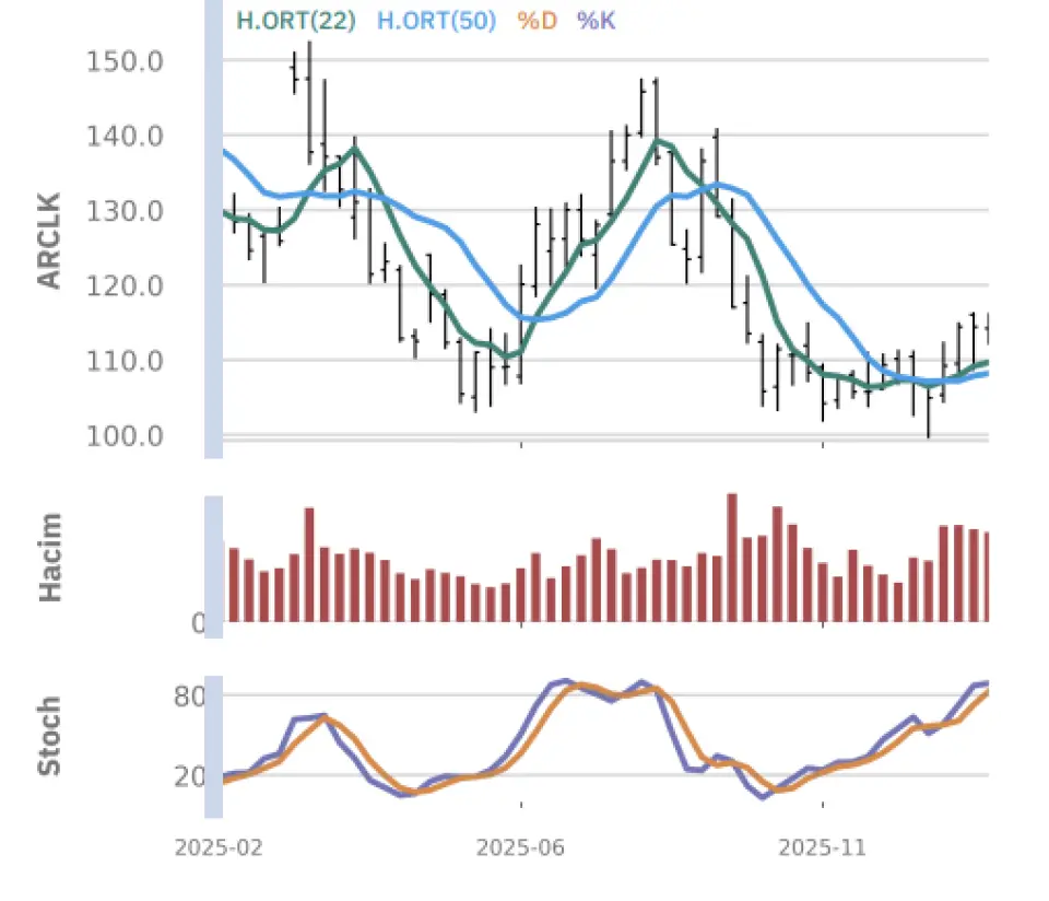 "Gün içinde en düşük 112.20 en yüksek 116.10 seviyesini gören Arçelik hissesinin günü %1.31 kayıpla tamamladığı gözlenmektedir. Pivot seviye 113.77 seviyesinden geçmekte olup, aşağı yönlü hareketlerde birinci destek 111.43, ikinci destek ise 109.87 seviyesinden geçmektedir. Dirençler ise sırasıyla 115.33, 117.67 seviyelerinden geçmektedir. Bu aşamada endeksin 5 günlük HO seviyesinin %0.20 üstünde, 22 günlük HO seviyesinin ise %3.05 üstünde hareket ettiği dikkat çekmektedir. Son gün işlem hacmi ise bu aşamada 5 günlük ortalama işlem hacminin % 37.34 üstünde gerçekleşmiştir."