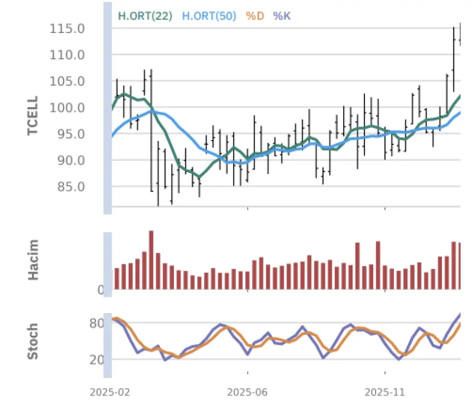 "Gün içinde en düşük 113.10 en yüksek 115.90 seviyesini gören Turkcell İletişim Hizmetleri hissesinin günü %0.35 kayıpla tamamladığı gözlenmektedir. Pivot seviye 114.47 seviyesinden geçmekte olup, aşağı yönlü hareketlerde birinci destek 113.03, ikinci destek ise 111.67 seviyesinden geçmektedir. Dirençler ise sırasıyla 115.83, 117.27 seviyelerinden geçmektedir. Bu aşamada endeksin 5 günlük HO seviyesinin %2.22 üstünde, 22 günlük HO seviyesinin ise %12.01 üstünde hareket ettiği dikkat çekmektedir. Son gün işlem hacmi ise bu aşamada 5 günlük ortalama işlem hacminin % 5.98 üstünde gerçekleşmiştir."