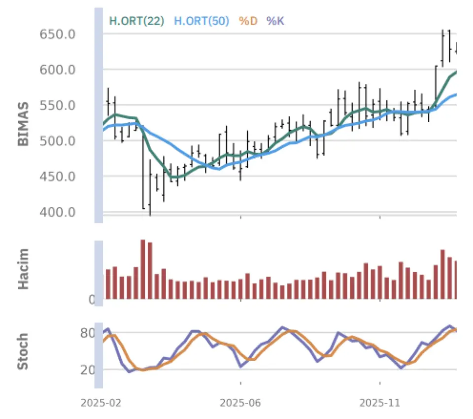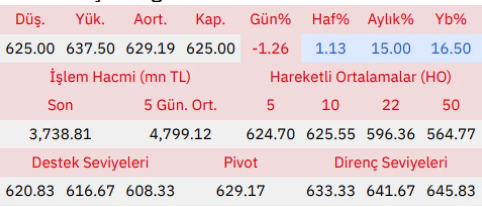 "Gün içinde en düşük 625.00 en yüksek 637.50 seviyesini gören BİM Birleşik Mağazalar hissesinin günü %1.26 kayıpla tamamladığı gözlenmektedir. Pivot seviye 629.17 seviyesinden geçmekte olup, aşağı yönlü hareketlerde birinci destek 620.83, ikinci destek ise 616.67 seviyesinden geçmektedir. Dirençler ise sırasıyla 633.33, 641.67 seviyelerinden geçmektedir. Bu aşamada endeksin 5 günlük HO seviyesinin %0.05 üstünde, 22 günlük HO seviyesinin ise %4.80 üstünde hareket ettiği dikkat çekmektedir. Son gün işlem hacmi ise bu aşamada 5 günlük ortalama işlem hacminin % 22.09 altında gerçekleşmiştir."