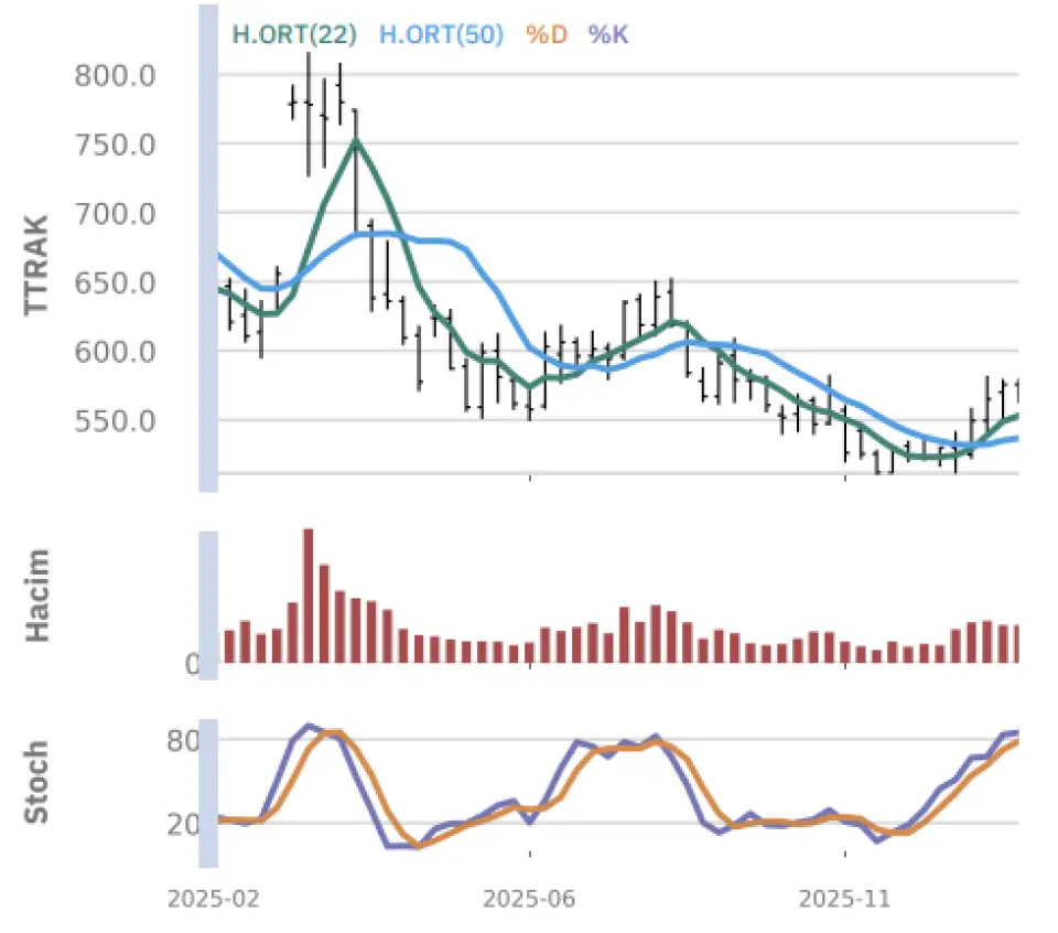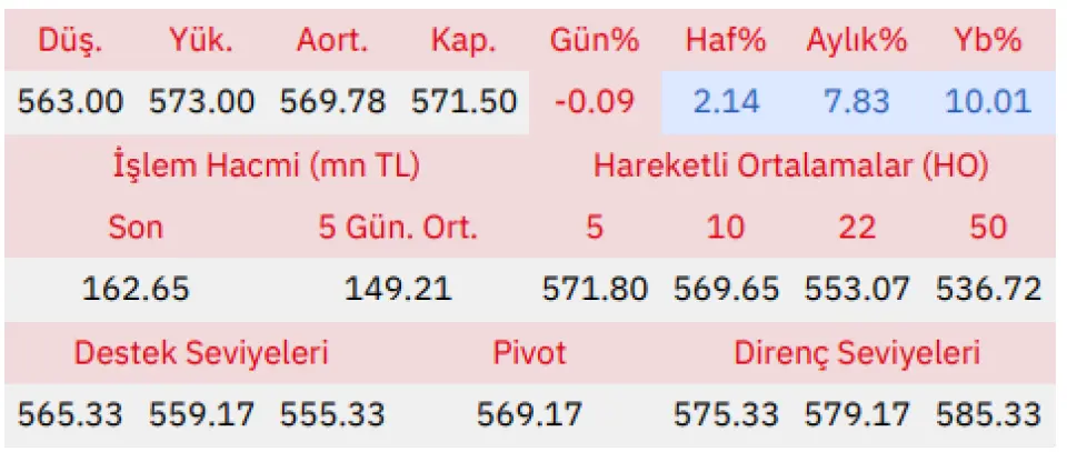 "Gün içinde en düşük 563.00 en yüksek 573.00 seviyesini gören Türk Traktör ve Ziraat Makineleri hissesinin günü %0.09 kayıpla tamamladığı gözlenmektedir. Pivot seviye 569.17 seviyesinden geçmekte olup, aşağı yönlü hareketlerde birinci destek 565.33, ikinci destek ise 559.17 seviyesinden geçmektedir. Dirençler ise sırasıyla 575.33, 579.17 seviyelerinden geçmektedir. Bu aşamada endeksin 5 günlük HO seviyesinin %0.05 altında, 22 günlük HO seviyesinin ise %3.33 üstünde hareket ettiği dikkat çekmektedir. Son gün işlem hacmi ise bu aşamada 5 günlük ortalama işlem hacminin % 9.01 üstünde gerçekleşmiştir."