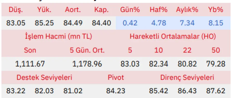 "Gün içinde en düşük 83.05 en yüksek 85.25 seviyesini gören Enka İnşaat ve Sanayi hissesinin günü %0.42 kazançla tamamladığı gözlenmektedir. Pivot seviye 84.23 seviyesinden geçmekte olup, aşağı yönlü hareketlerde birinci destek 83.22, ikinci destek ise 82.03 seviyesinden geçmektedir. Dirençler ise sırasıyla 85.42, 86.43 seviyelerinden geçmektedir. Bu aşamada endeksin 5 günlük HO seviyesinin %1.65 üstünde, 22 günlük HO seviyesinin ise %4.42 üstünde hareket ettiği dikkat çekmektedir. Son gün işlem hacmi ise bu aşamada 5 günlük ortalama işlem hacminin % 5.71 altında gerçekleşmiştir."