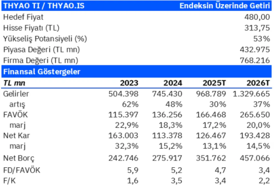 THYAO için ise verilen hedef fiyat 480 TL ve kazanç potansiyeli ise %53.