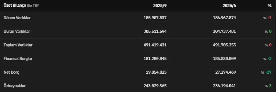 Dönen varlıklar 2025 yılının üçüncü çeyreğinde 185.907.837.000 TL olmuştur. 2025 yılının üçüncü çeyreğinde 305.511.594.000 TL olarak açıklanan duran varlıklar, 2025 yılının ikinci çeyreğinde 304.737.481.000 TL olarak açıklanmıştı. Toplam varlıklar üçüncü çeyrekte 491.419.431.000 TL olarak kaydedildi. Finansal borçlar 2025 yılının üçüncü çeyreğinde 181.280.845.000 TL olarak kaydedildi.