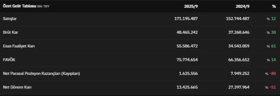 FAVÖK 2025 yılının üçüncü çeyreğinde 75.774.654.000 TL olarak açıklandı. 2024 yılının üçüncü çeyreğinde 66.356.652.000 TL olarak açıklanan FAVÖK, 3. çeyrekte %14 artmış oldu. Net parasal pozisyon kazançları 2025 yılının üçüncü çeyreğinde 1.625.556.000 TL olarak kaydedildi. Net dönem kârı ise 13.425.665.000 TL olarak kaydedildi.
