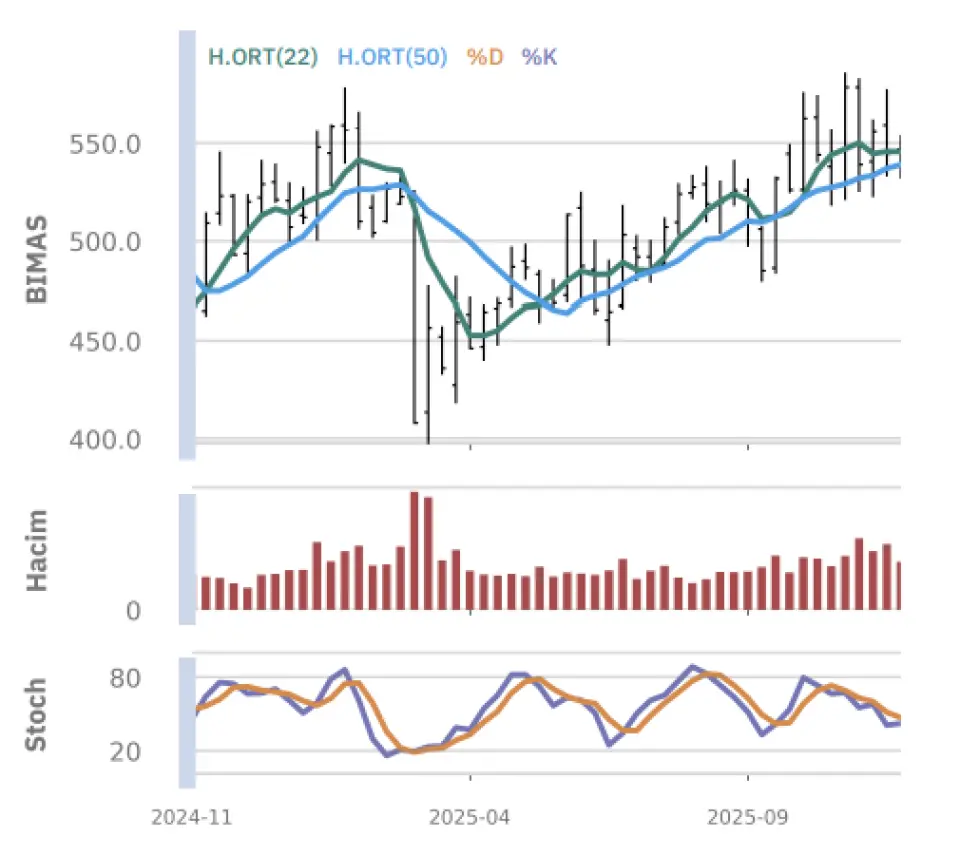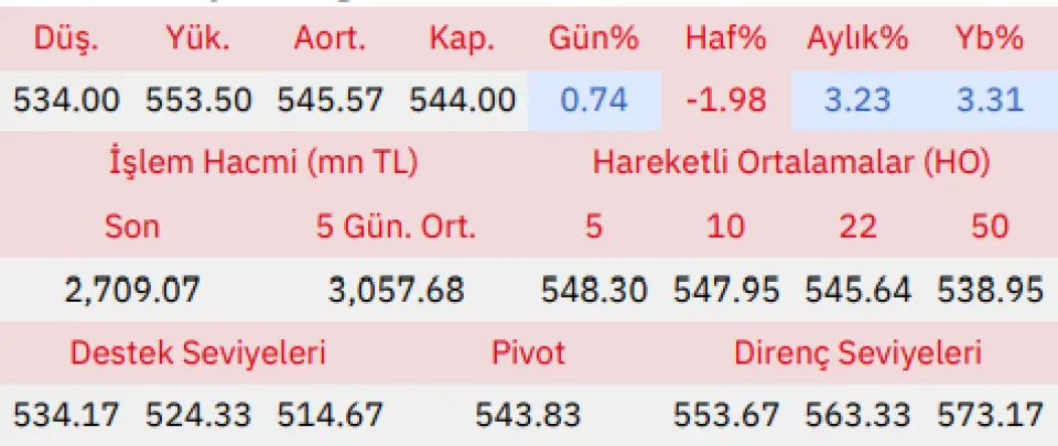 "Gün içinde en düşük 534.00 en yüksek 553.50 seviyesini gören BİM Birleşik Mağazalar hissesinin günü %0.74 kazançla tamamladığı gözlenmektedir. Pivot seviye 543.83 seviyesinden geçmekte olup, aşağı yönlü hareketlerde birinci destek 534.17, ikinci destek ise 524.33 seviyesinden geçmektedir. Dirençler ise sırasıyla 553.67, 563.33 seviyelerinden geçmektedir. Bu aşamada endeksin 5 günlük HO seviyesinin %0.78 altında, 22 günlük HO seviyesinin ise %0.30 altında hareket ettiği dikkat çekmektedir. Son gün işlem hacmi ise bu aşamada 5 günlük ortalama işlem hacminin % 11.40 altında gerçekleşmiştir."